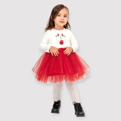 Simli Tül Noel Baskılı Elbise 9-24 Ay